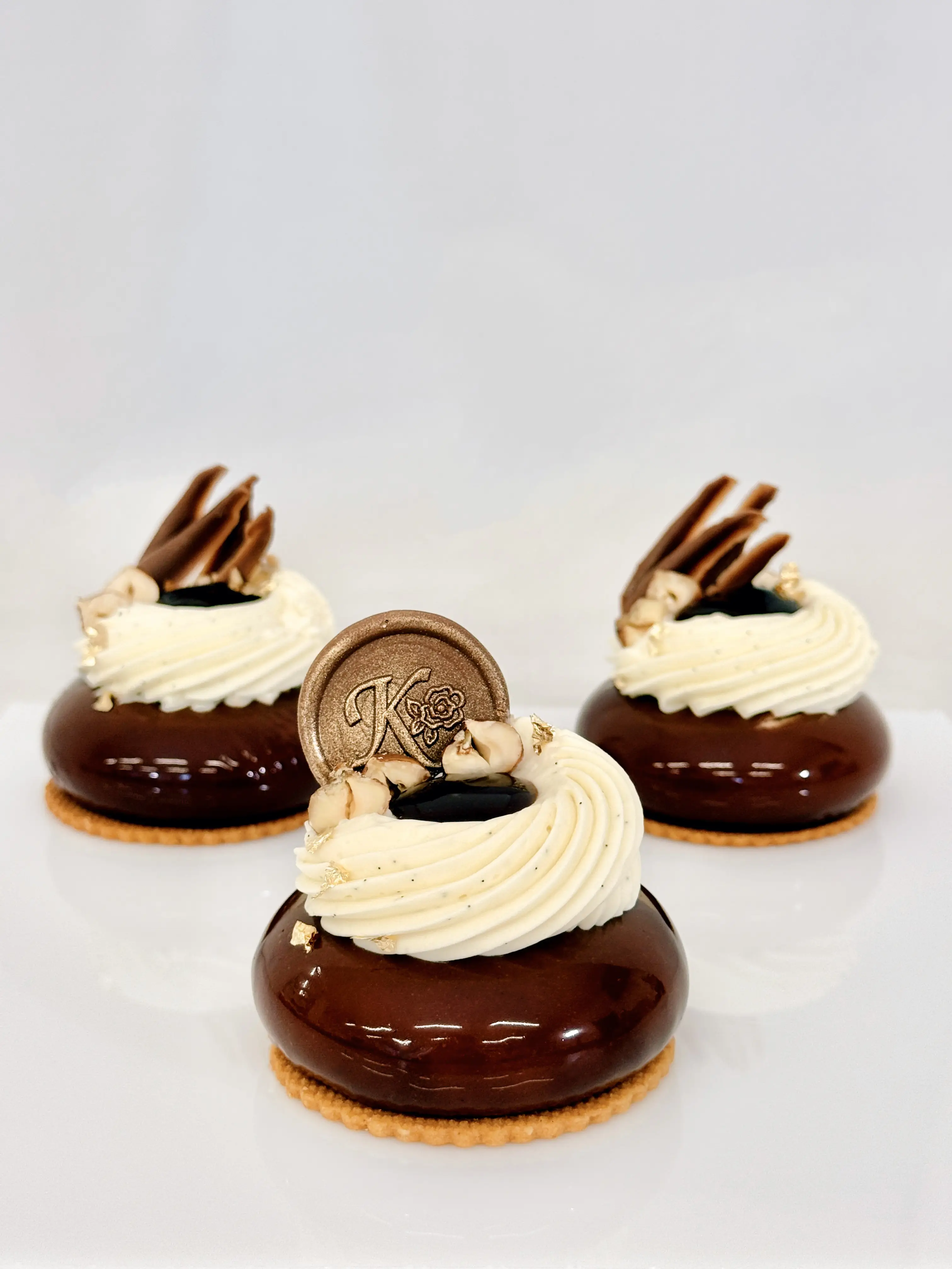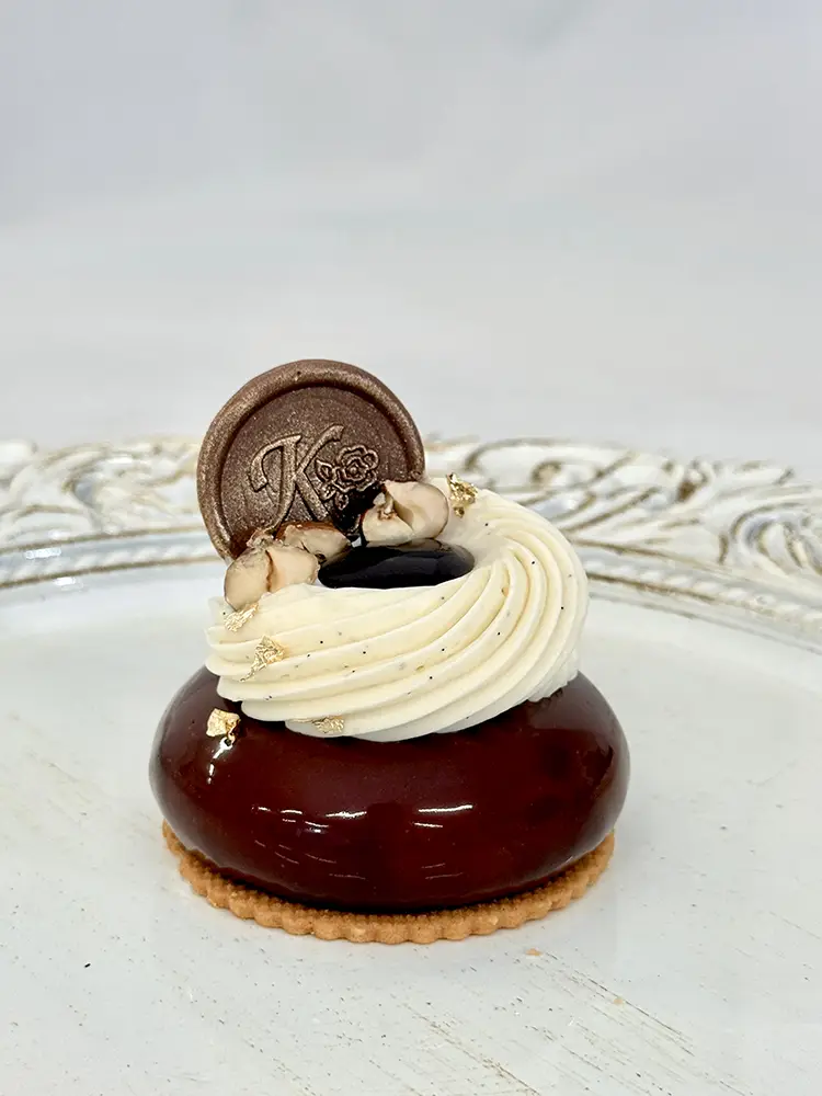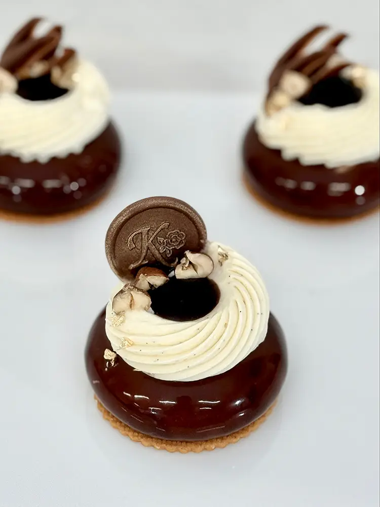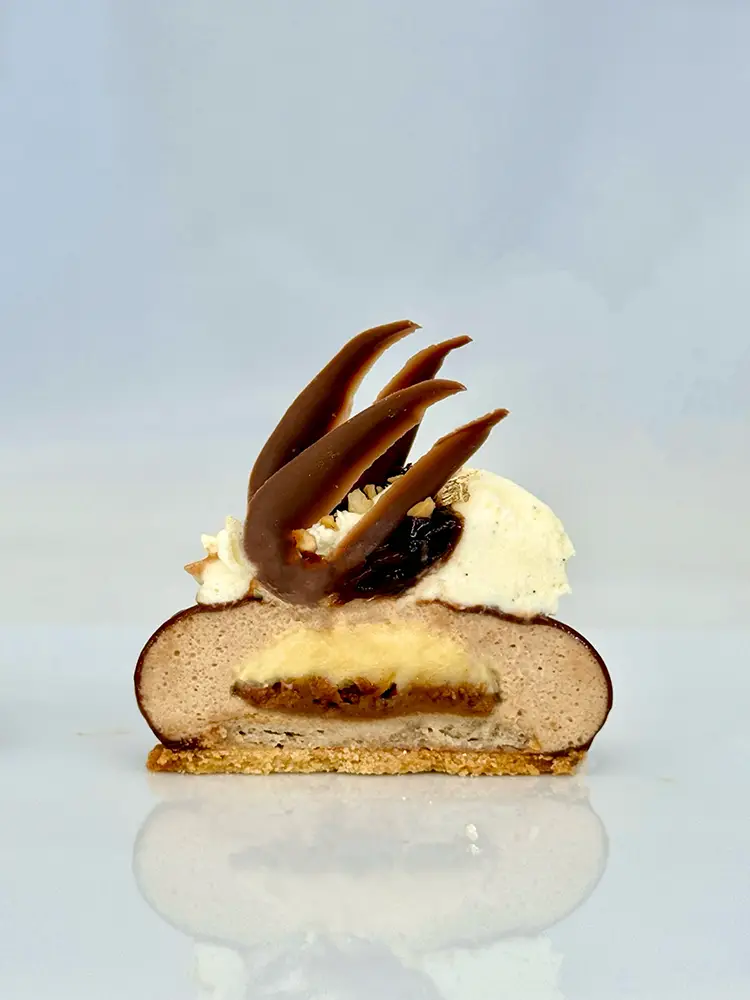Elegantná kombinácia praliné mousse a sviežim citrusovým Crème brûlée krémom ukrytá v modernom tvare, ktorý prekvapí nielen tvarom ale aj textúrou. V základe sa ukrýva chrumkavý krém a feuilletine, s vynikajúcim jemným lieskovo- orieškovým korpusom dacquoise, ktorý dodá dezertu ľahký kontrast k jemnej mousse a ovocnej vrstve.