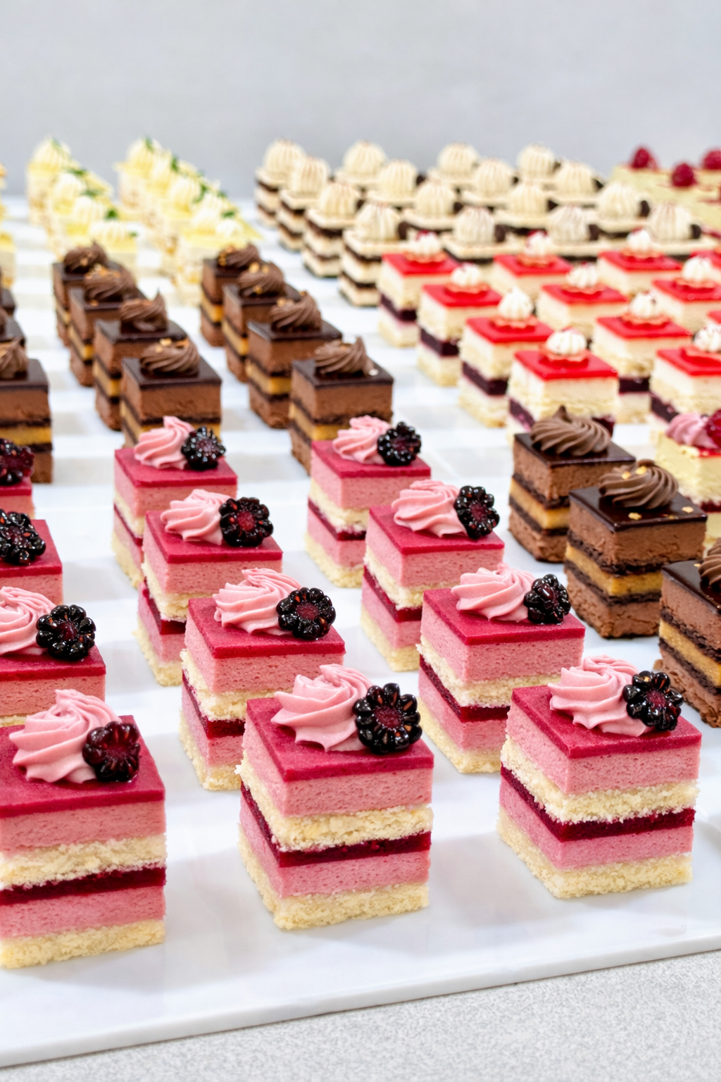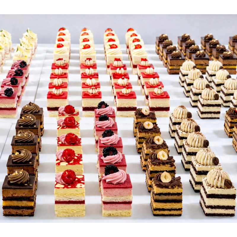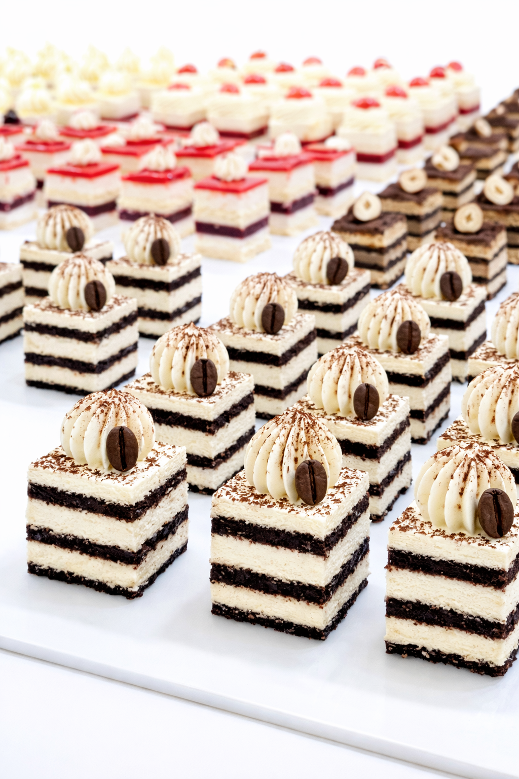- mini rezy s jemnými mousse, ganache a ovocnými náplňami
